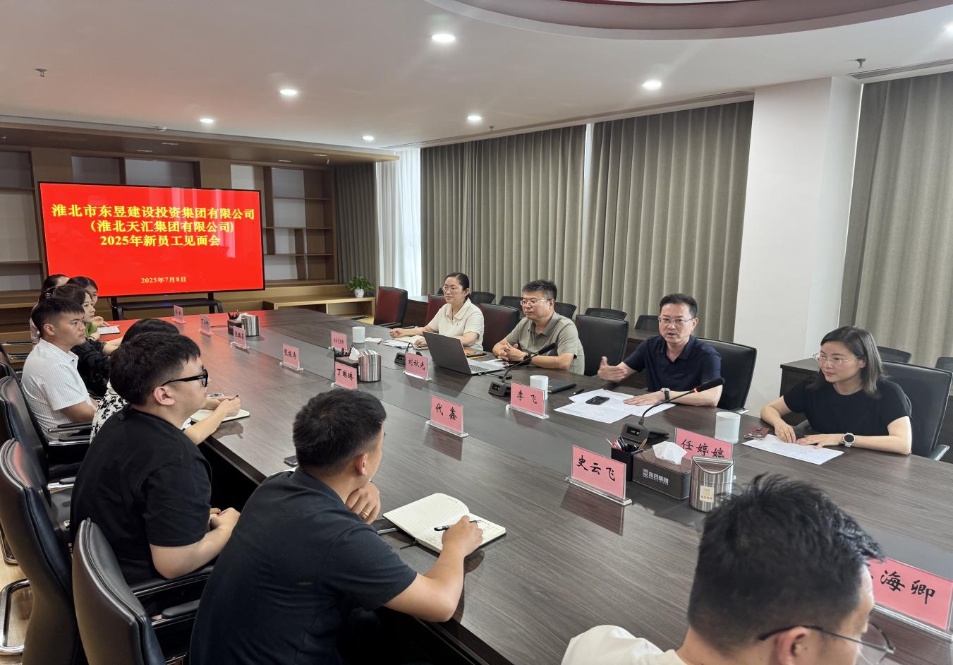 09 07月2025 了解詳情 淮北市東昱建設投資集團有限公司召開2025年新員工見面會 7月8日下午,淮北市東昱建設投資集團有限公司舉行2025年新員工見面會,集團公司董事長李飛、總經理任婷婷、董事會秘書劉秋光出席會議,14名新入職員工參加見面會。